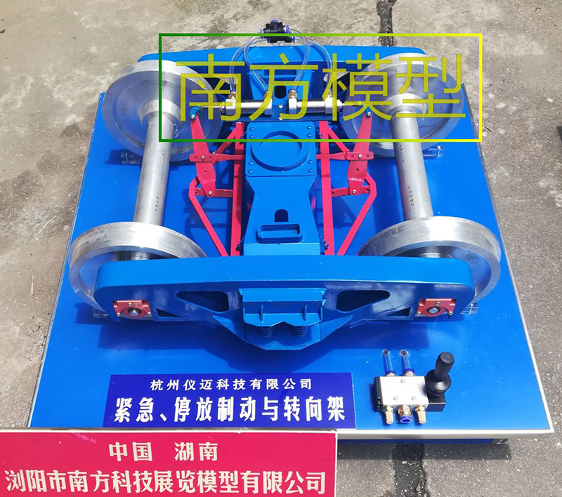 (5) 轉向架模型實訓裝置噴涂為實物顏色 (6) 設備配路基底盤和鋼軌,并用止輪器固定 |